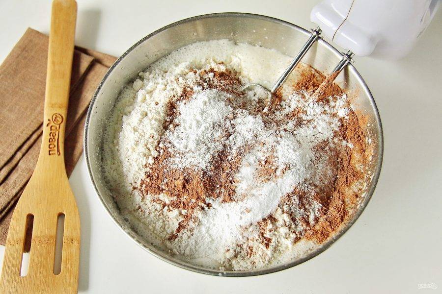 Добавьте просеянную муку, какао и разрыхлитель.