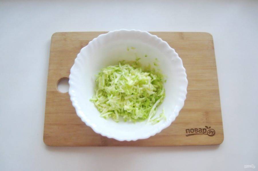 Кабачок помойте, очистите и натрите на крупной терке. Если он не очень водянистый, то можно не отжимать от сока. У меня был сухой.