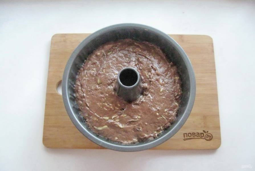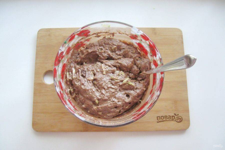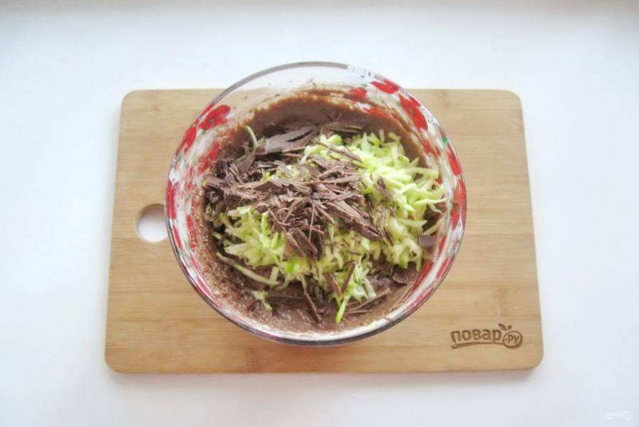 Выложите тертый кабачок в миску с тестом. Добавьте шоколад, который следует нарезать ножом.
