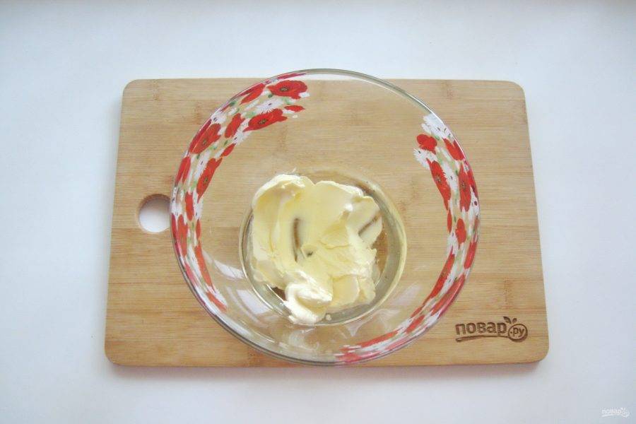 В другую миску выложите мягкое сливочное масло и налейте подсолнечное рафинированное масло.