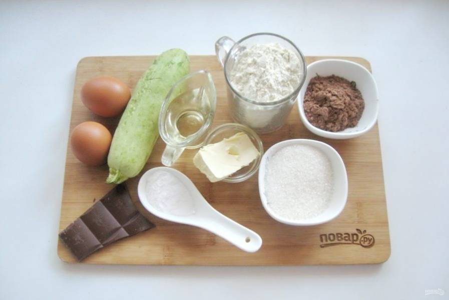 Подготовьте ингредиенты для приготовления шоколадного кекса с кабачком.