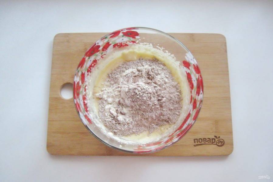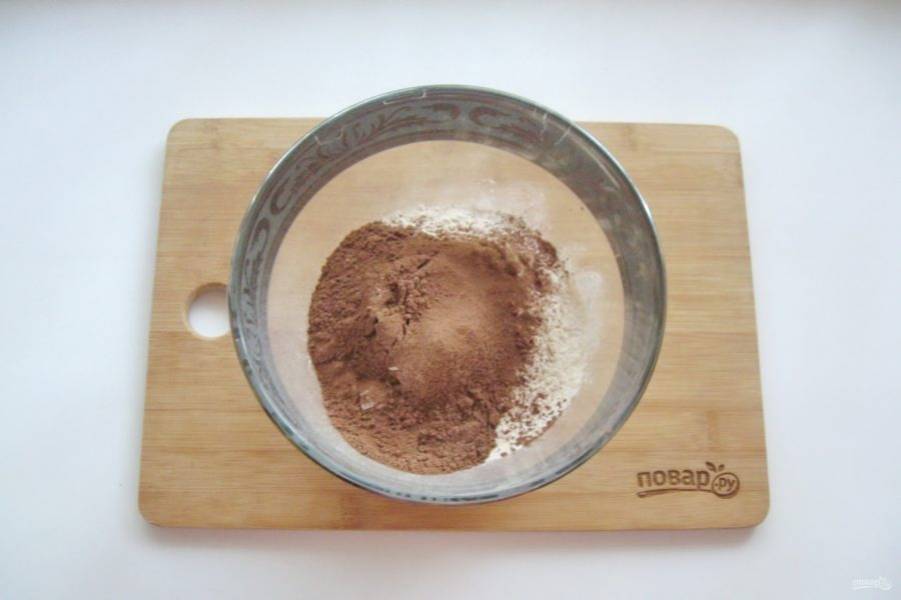В миску насыпьте просеянную муку, какао-порошок и разрыхлитель. Перемешайте эти ингредиенты.