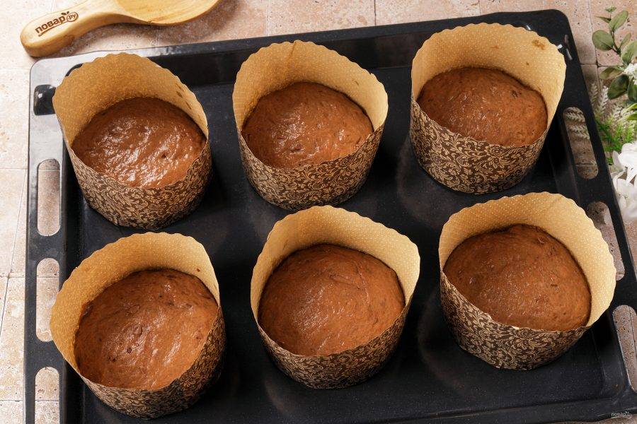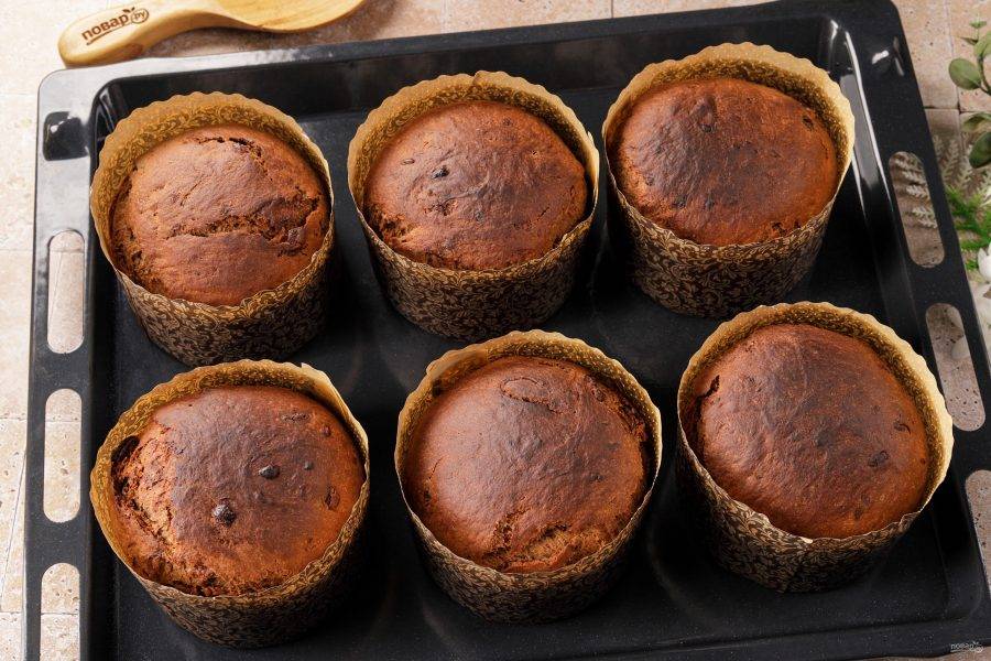 Накрываем их пакетом и полотенцем и оставляем в тёплом месте на 20 минут. Духовку прогрейте до 170 градусов, решётку установите на третий уровень снизу, поставьте формы с тестом и выпекайте 25-30 минут. Через 20 минут можно открыть духовку и накрыть куличи фольгой, если вы увидите, что они сильно у вас подрумянились. Готовность проверяйте деревянной шпажкой — на выходе она должна быть чистой и сухой. Достаньте куличи из духовки и дайте полностью остыть.