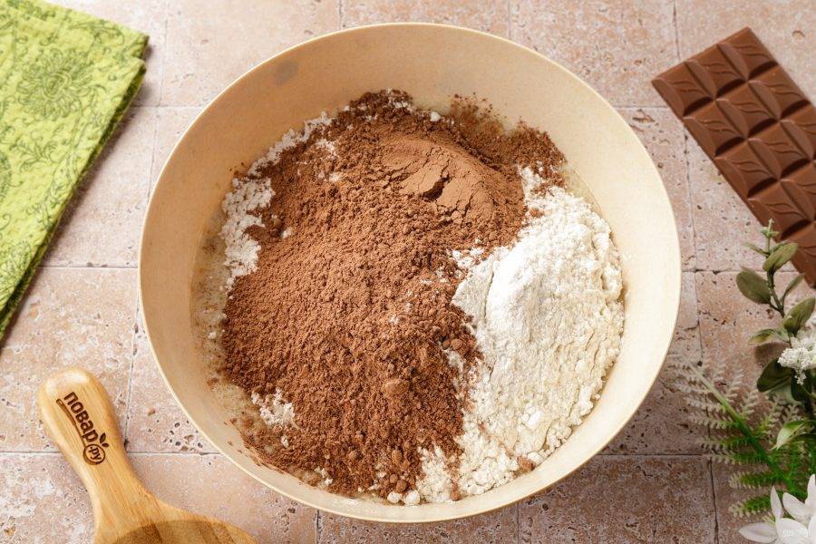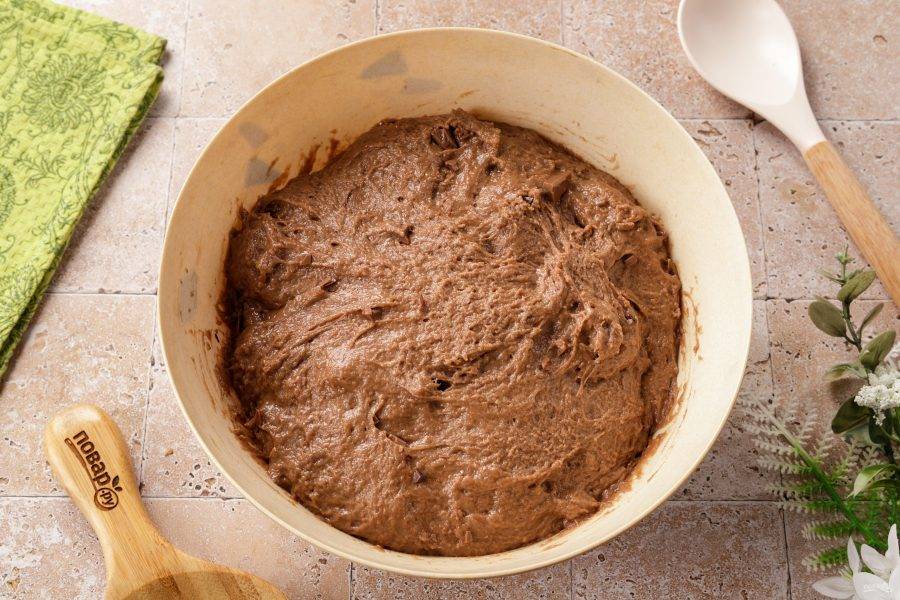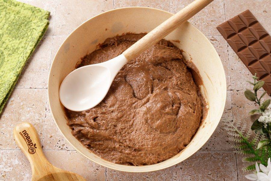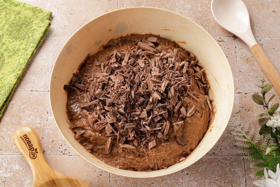 Добавьте колотый шоколад. Шоколад можно заменить на термостабильные шоколадные капли.