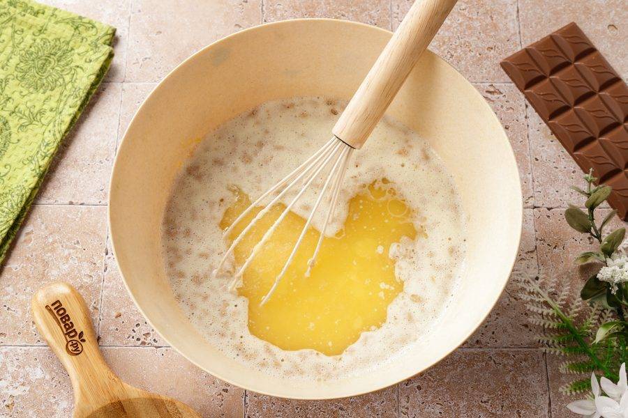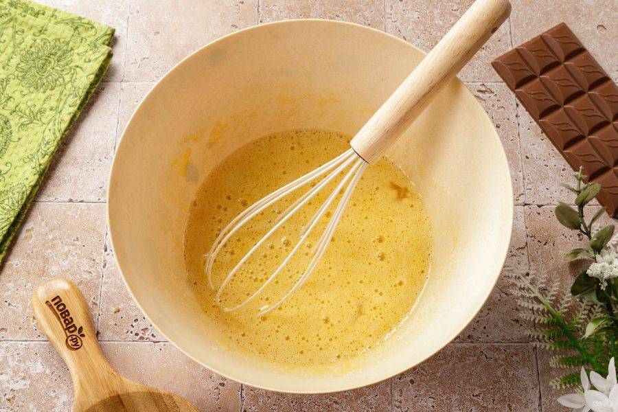 В глубокой миске соедините сахар и яйца. Взбейте.