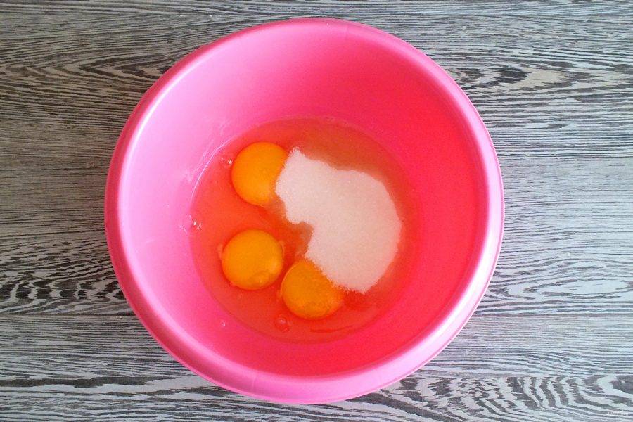 В отдельной чаше взбейте яйца с сахаром в пышную массу.