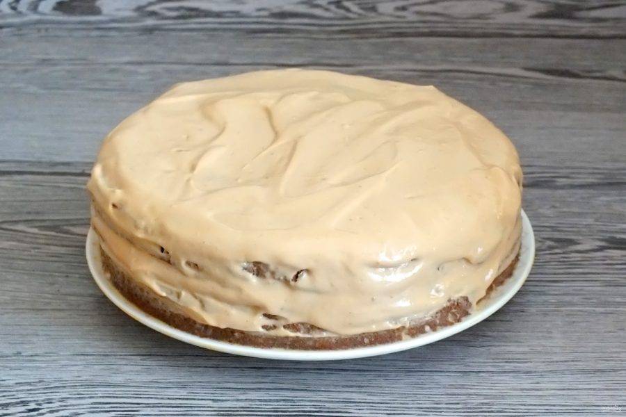 Достаньте крем из холодильника, и прослоите коржи.