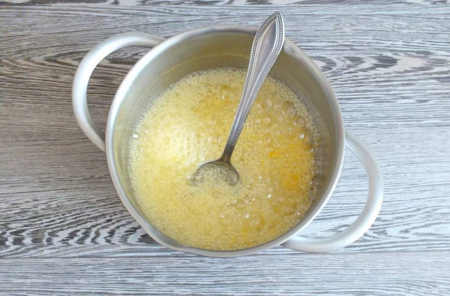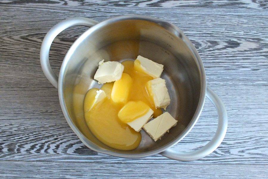 В кастрюле с толстым дном соедините сливочное масло и мёд. Поставьте на огонь чуть ниже среднего. Как только масса станет однородной, добавьте соду.