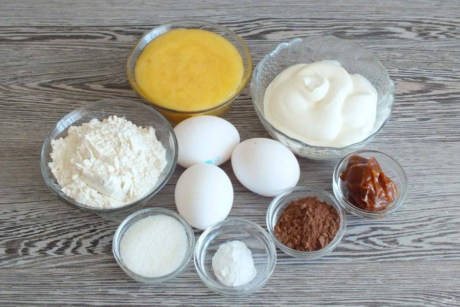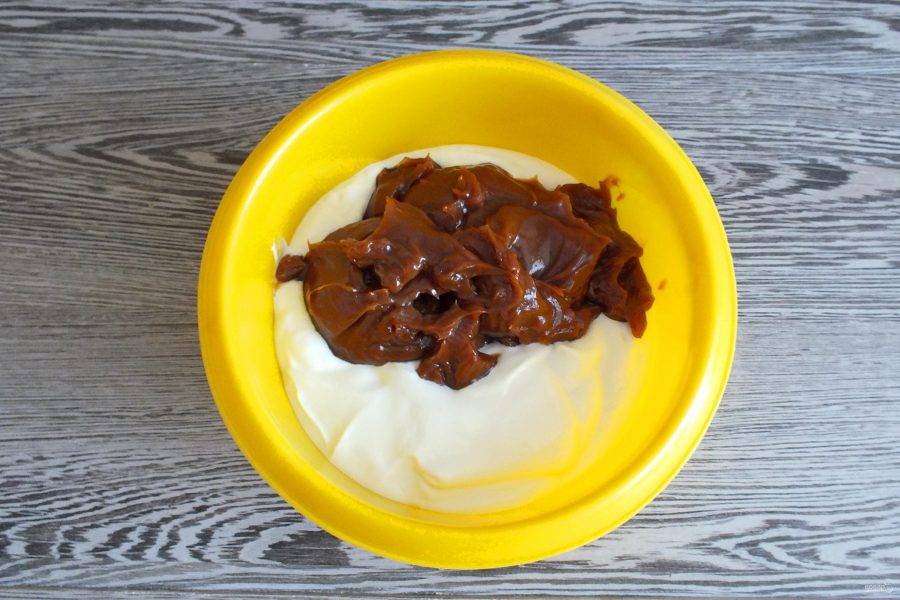 Сделайте крем. В чаше соедините сметану и вареную сгущенку.