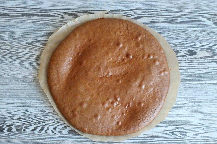 Готовый корж достаньте из духовки, снимите бумагу, переложите на блюдо и охладите. Испеките оставшиеся части. Испеченные коржи охлаждайте отдельно, не складывая друг на друга.