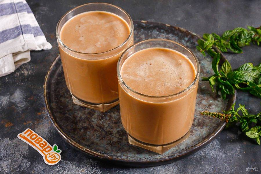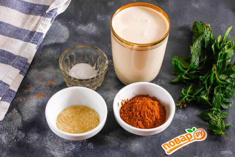 Перелейте ряженку в глубокую емкость, влейте туда же жидкость с желатином и всыпьте сахар или его заменитель, какао-порошок. Отпюрируйте все погружным блендером примерно 1-2 минуты.