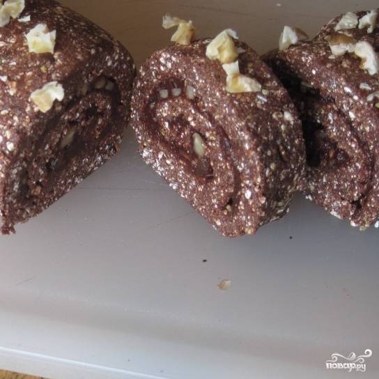Получившийся рулет сверху посыпаем рубленным грецким орехом (для красоты), даем немного постоять и скрепиться, после чего нарезаем на кусочки (из данного количества ингредиентов получилось 12 кусочков) и подаем. Приятного аппетита! :)