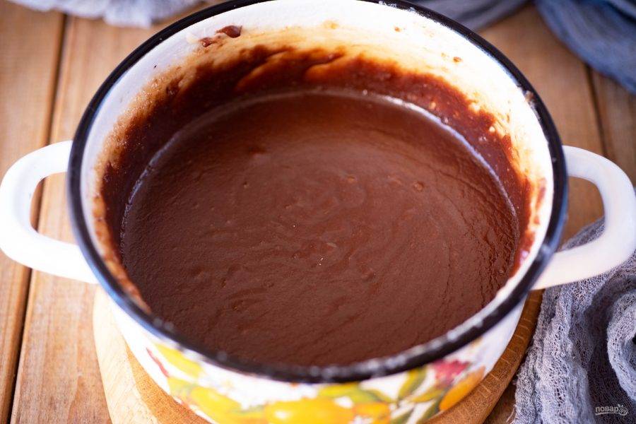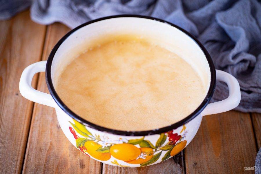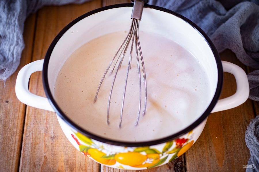 Цвет смеси к середине процесса уваривания начнет меняться с белого на кремовый, а сама смесь начнет понемногу загустевать.