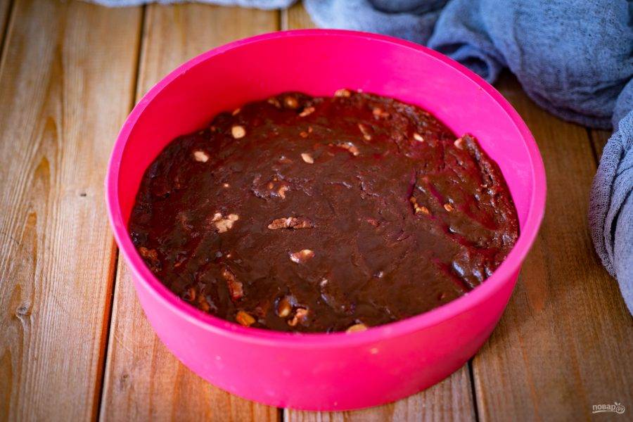 Выложите шоколадно-ореховую массу в удобную для застывания форму — у меня силиконовая форма и это очень удобно. Разровняйте массу ложкой и оставьте на столе застывать. Если щербет правильно приготовлен (время уваривания и количество ингредиентов соблюдено), то он отлично застынет как при комнатной температуре, так и в холодильнике. У меня щербет застыл в течение часа на подоконнике.