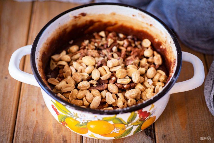 Затем добавьте в шоколадную массу грецкие орехи и арахис. Перемешайте все ложкой.