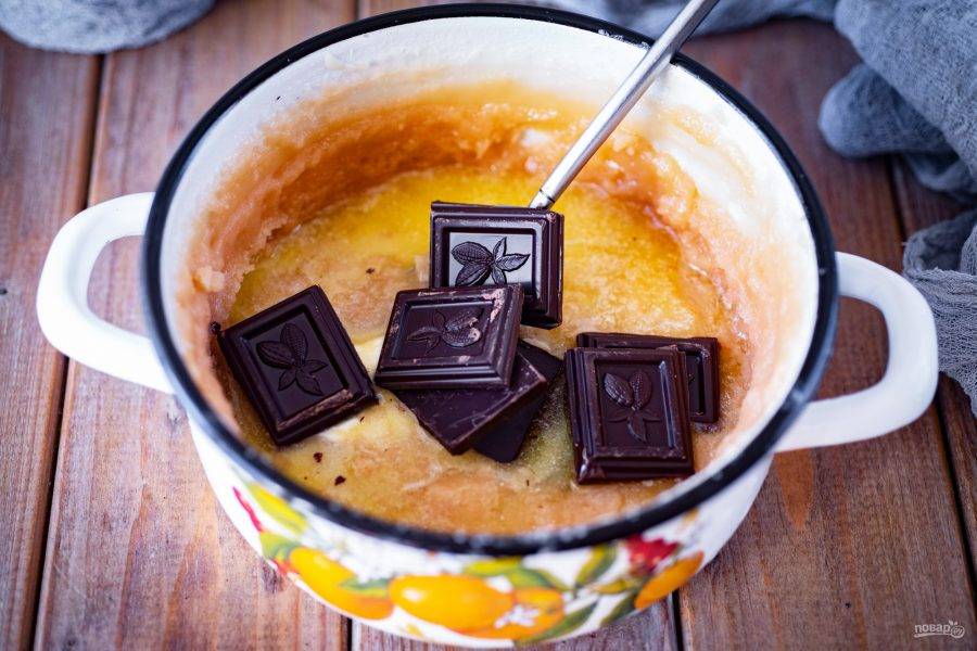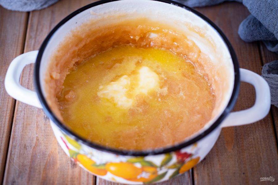 Через 50 минут уваривания добавьте сливочное масло и вмешайте его в смесь.