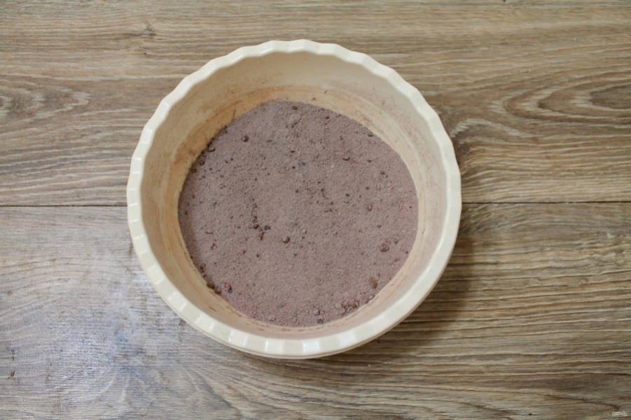 В миску просейте муку, разрыхлитель, какао, соду, всыпьте сахар, соль и перемешайте.