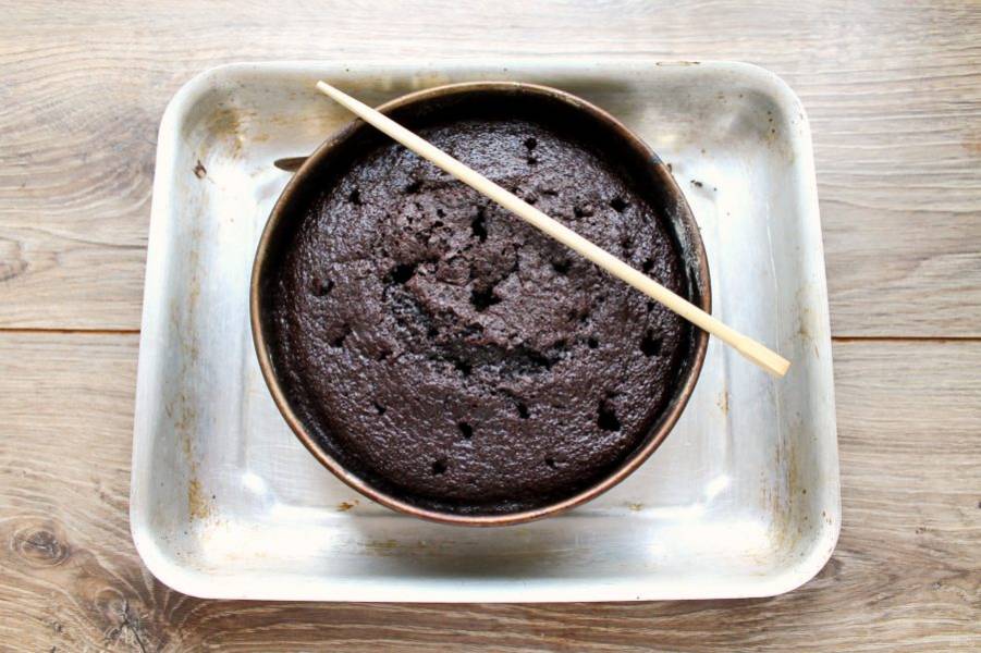 В разъемную форму 18 сантиметров вылейте тесто и поставьте в горячую духовку. Выпекайте бисквит при температуре 180 градусов в течение 30 минут, до готовности. Достаньте форму с бисквитом и сделайте при помощи палочки для суши или ручки деревянной ложки множество дырочек по всей поверхности.