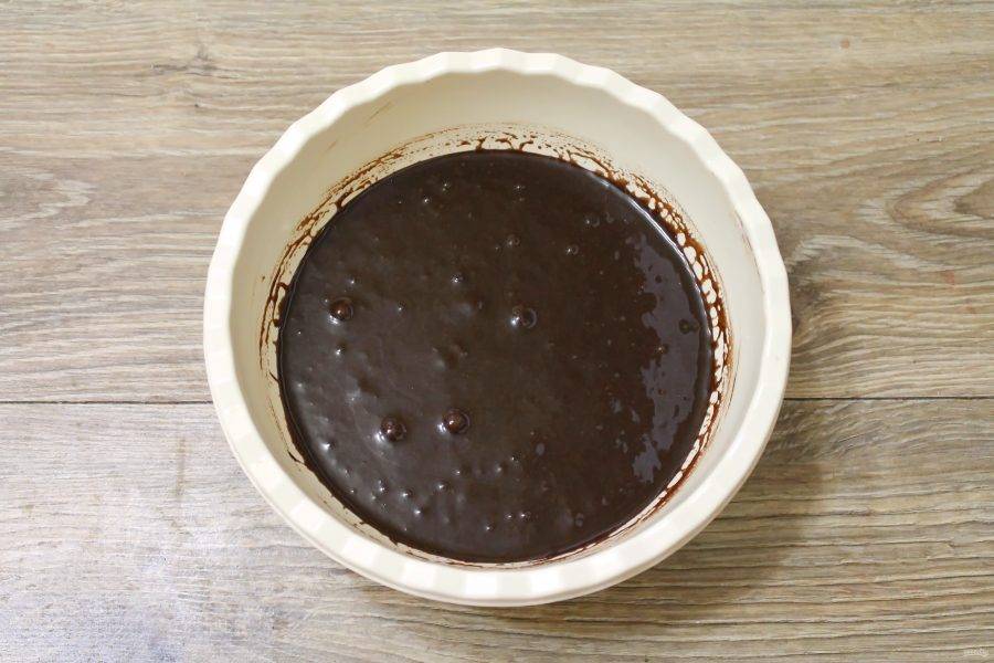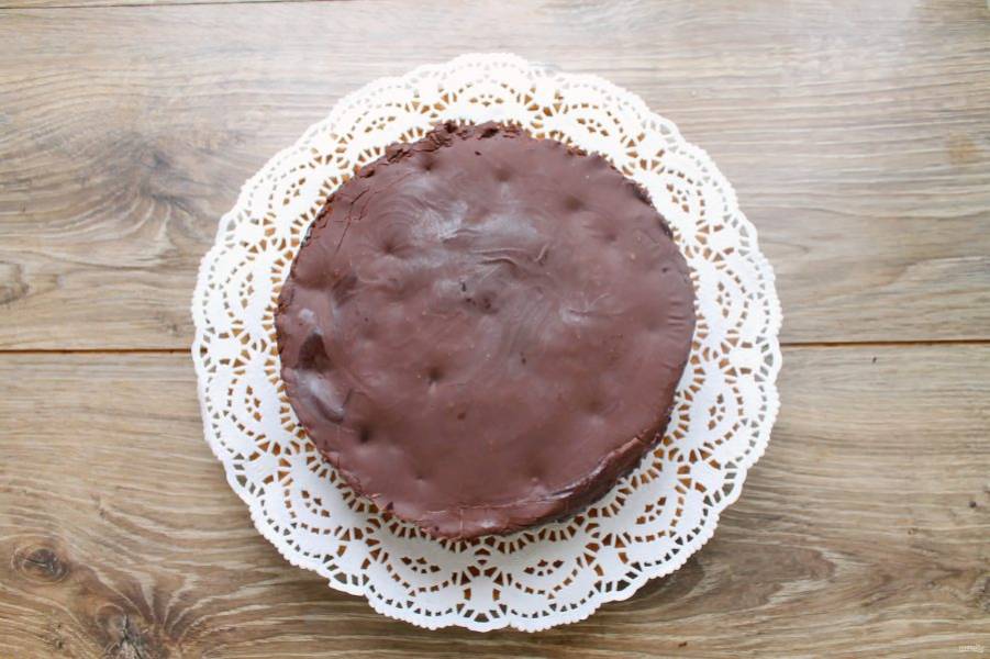 Вылейте шоколадную массу поверх горячего бисквита и разровняйте. Оставьте в холодное место на два часа. Аккуратно извлеките бисквит из формы.