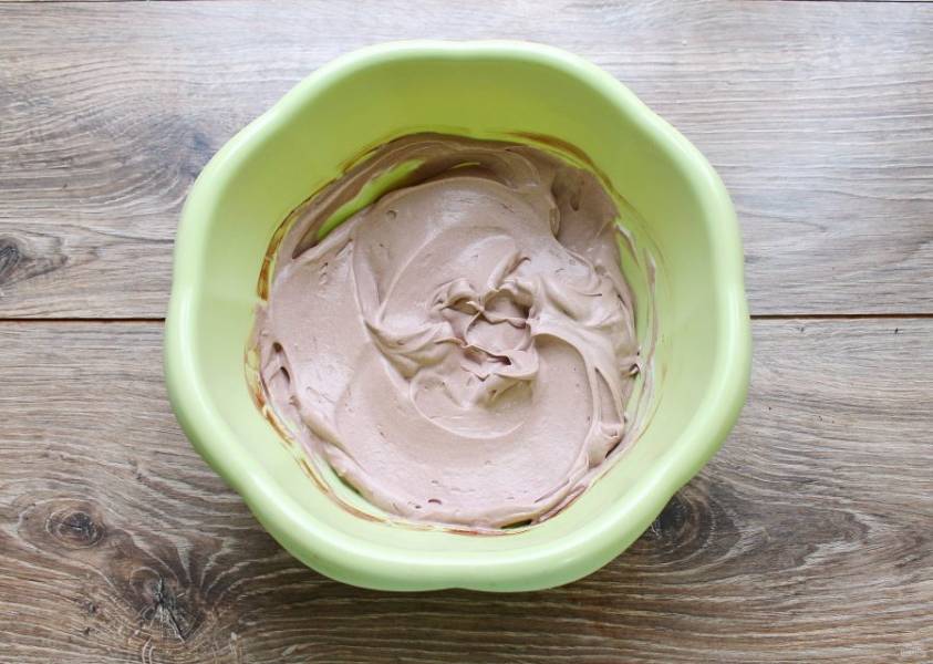 В миску налейте холодные сливки, всыпьте сахарную пудру, просейте какао и взбейте до пышного крема.