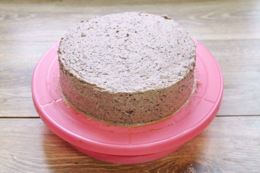 При помощи кондитерской спатулы или широкого ножа нанесите крем на бока и верх торта, выровните.
