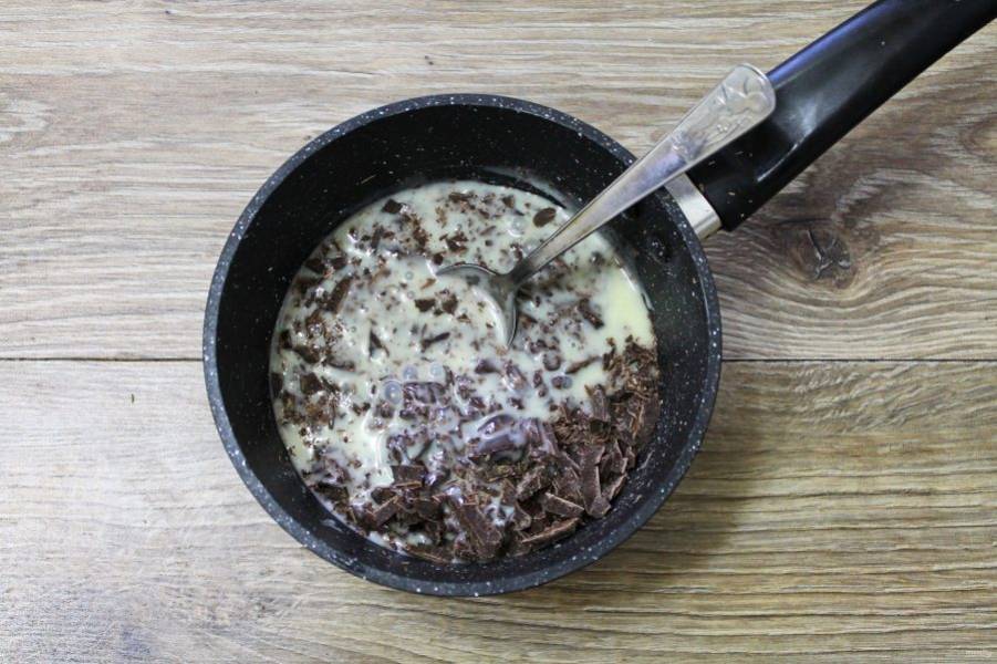 В сотейник с толстым дном влейте сгущенное молоко и добавьте измельченный шоколад. Поставьте на водяную баню и мешая доведите до однородного состояния.