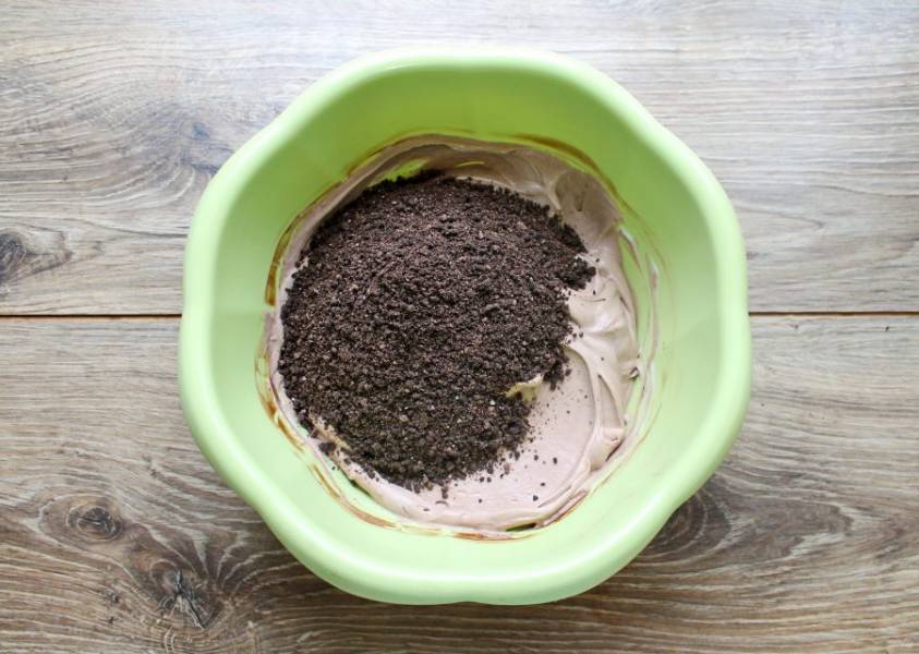 Печенье "Орео" измельчите и превратите в крошку. Добавьте печенье в крем и аккуратно перемешайте.