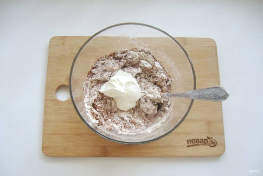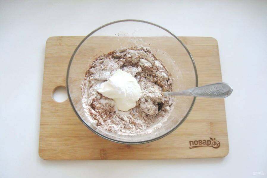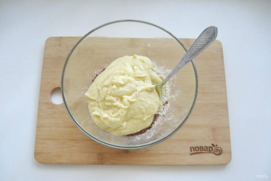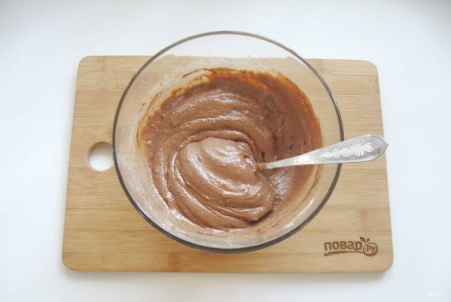 Полученную смесь выложите в миску с мукой и какао.