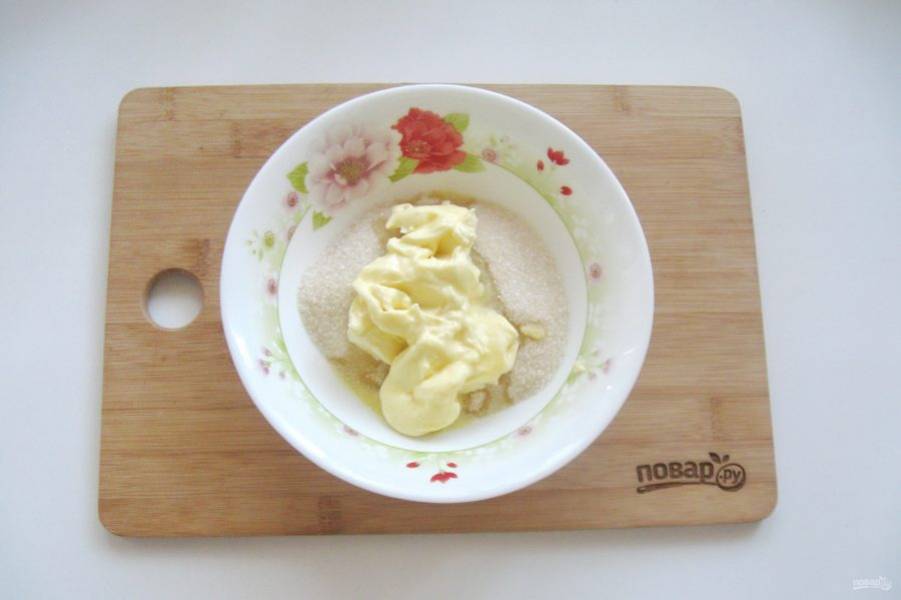 В другую миску выложите сахар и мягкое сливочное масло.