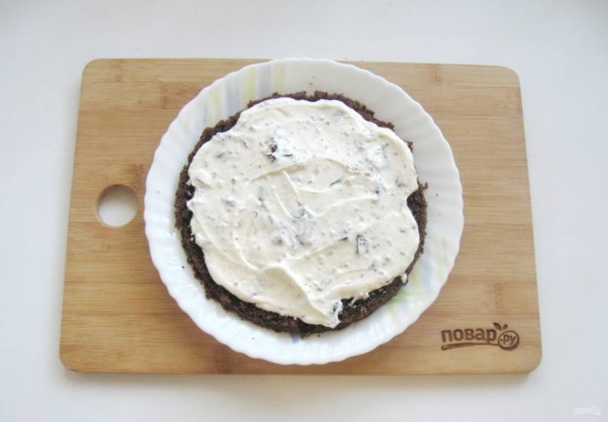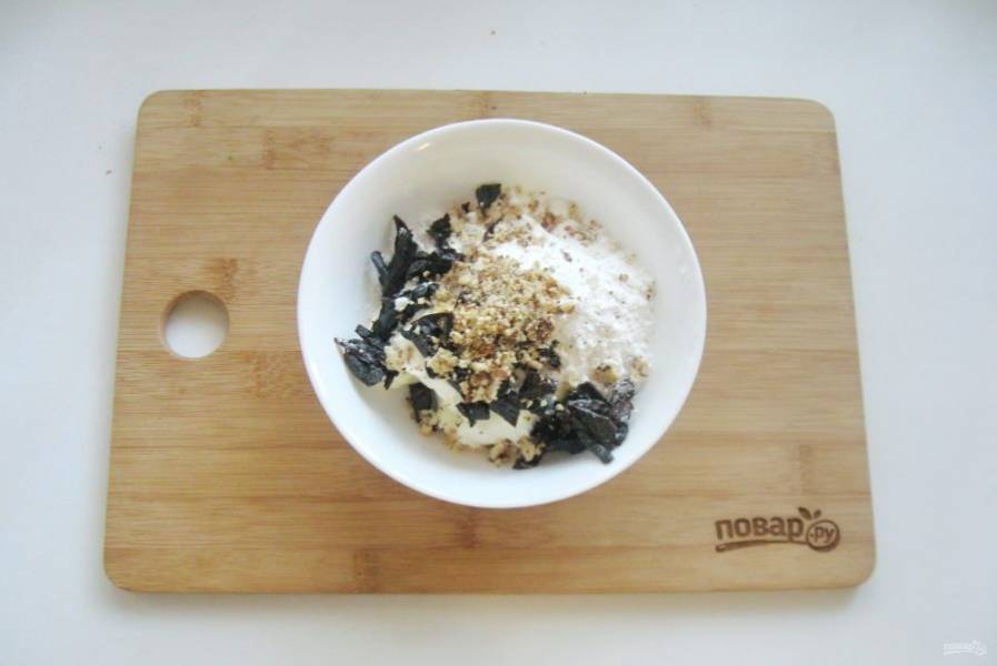 Чернослив предварительно залейте горячей водой и дайте постоять 20 минут. После воду слейте, а чернослив мелко нарежьте. Грецкие орехи прокалите в духовке или на сковороде, измельчите. Добавьте чернослив и орехи в крем. Перемешайте все ингредиенты крема.