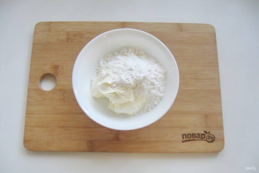 Приготовьте крем для торта. В миску выложите сметану. Добавьте сахарную пудру. Перемешайте и отложите 150 грамм в отдельную посуду.