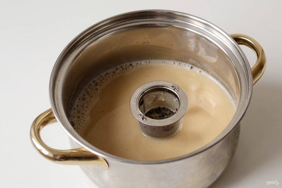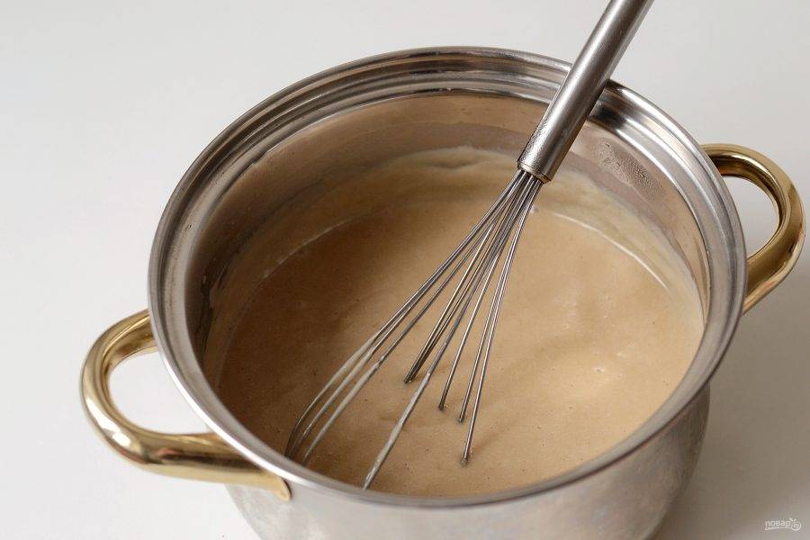 Добавьте агар-агар, все пряности и муку. Варите крем до загустения, постоянно помешивая.