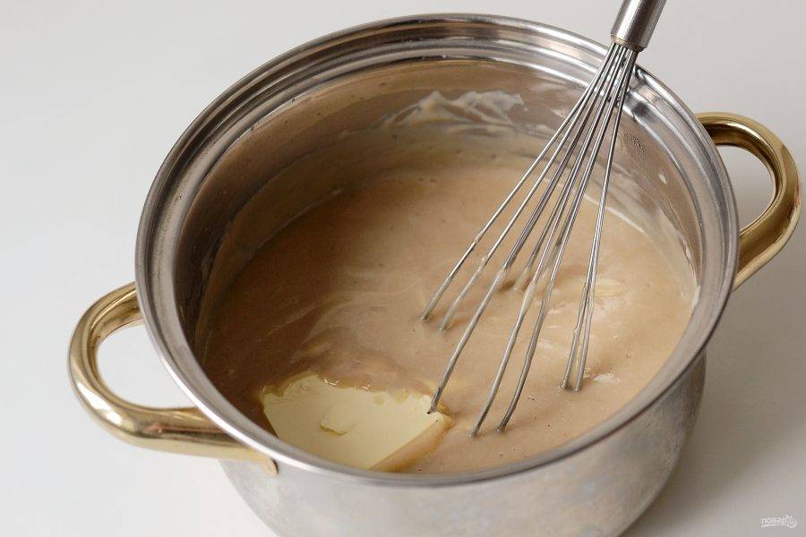 Остудите крем до почти комнатной температуры, добавьте сливочное масло и размешайте.