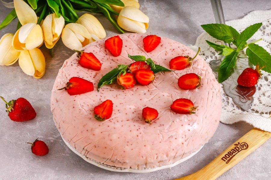 Ароматный и прохладный муссовый торт идеален для жаркого лета, особенно если вы сделаете сам мусс из клубники. От кусочка такого десерта не откажется никто, но помните, что он застывает около 3 часов.