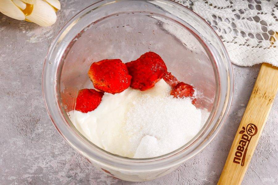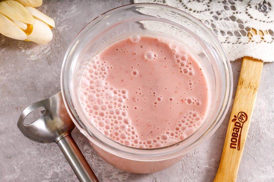 Измельчите клубнику, влейте в емкость жидкость с желатином и добавьте сметану любой жирности либо сливки. Норму сахара не уменьшайте, так как желатин "вбирает" в себя треть сладости! Все перемешайте.