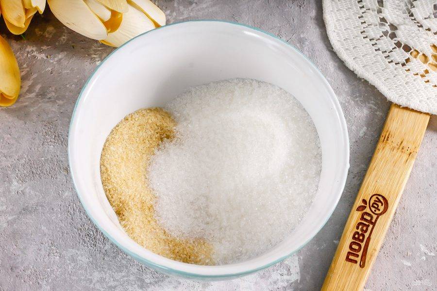 В это время залейте желатин и 50 грамм сахара кипятком и перемешайте. Оставьте на 20-25 минут и снова перемешайте.