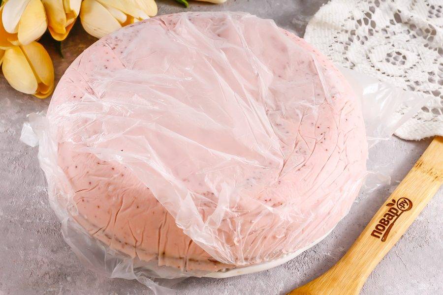 Поместите форму в холодильник минимум на 3-4 часа, а лучше — оставьте на ночь. Затем слегка потяните за пищевую пленку, чтобы она отстала от стенок чаши. Затем переверните форму на тарелку. Торт выпадет из формы. Удалите пленку.