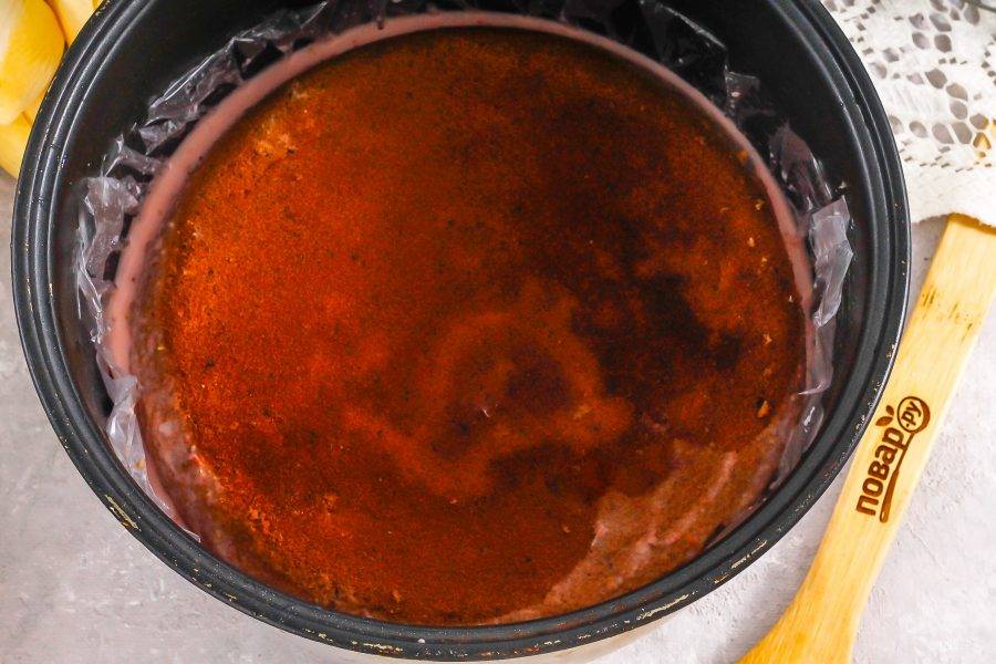 У вас должно получиться тягучее шоколадное бисквитное тесто. Разогрейте духовку до 180 градусов и смажьте форму любым маслом. Либо испеките бисквит в мультиварке, он получится более пышным.