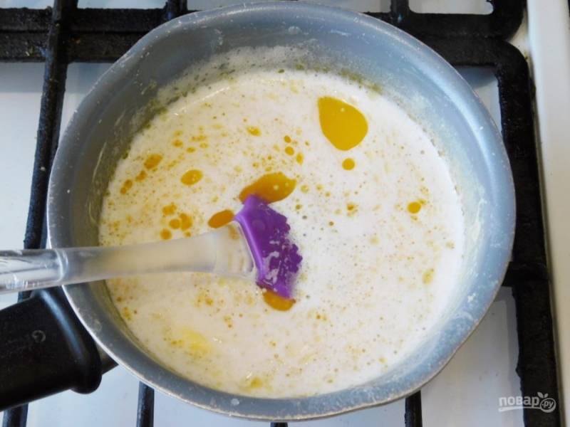 Сливочное масло залейте молоком и поставьте на огонь. Доведите до кипения и проварите, чтобы масло полностью растаяло.