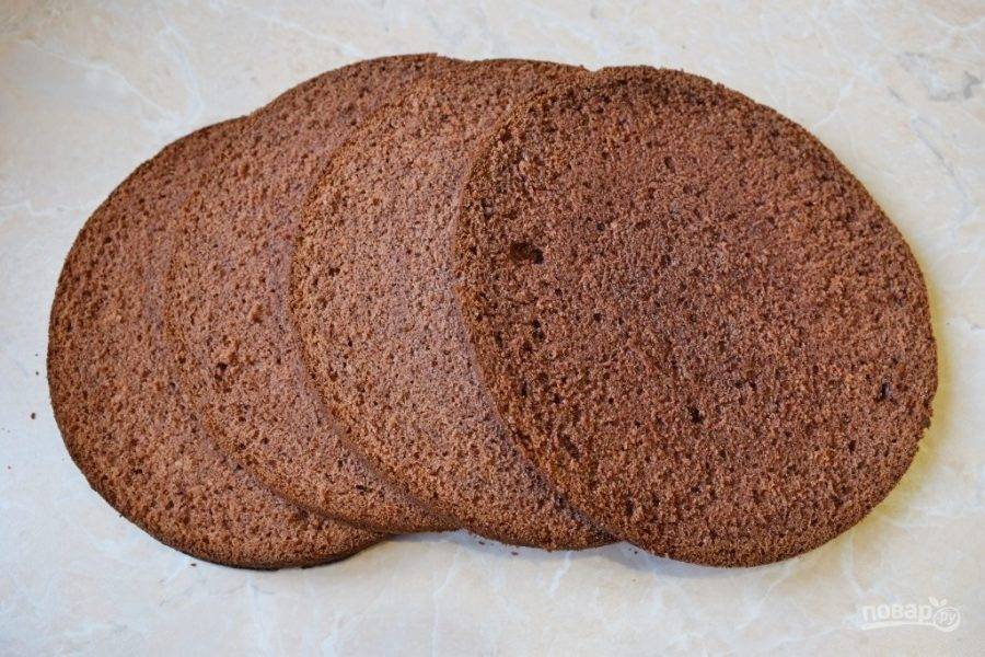 Готовый бисквит остудите и нарежьте на 4 коржа.