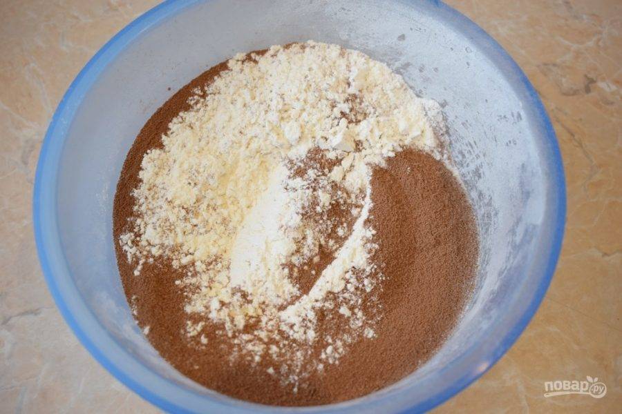 Муку просейте через сито. Добавьте к ней соду и какао.