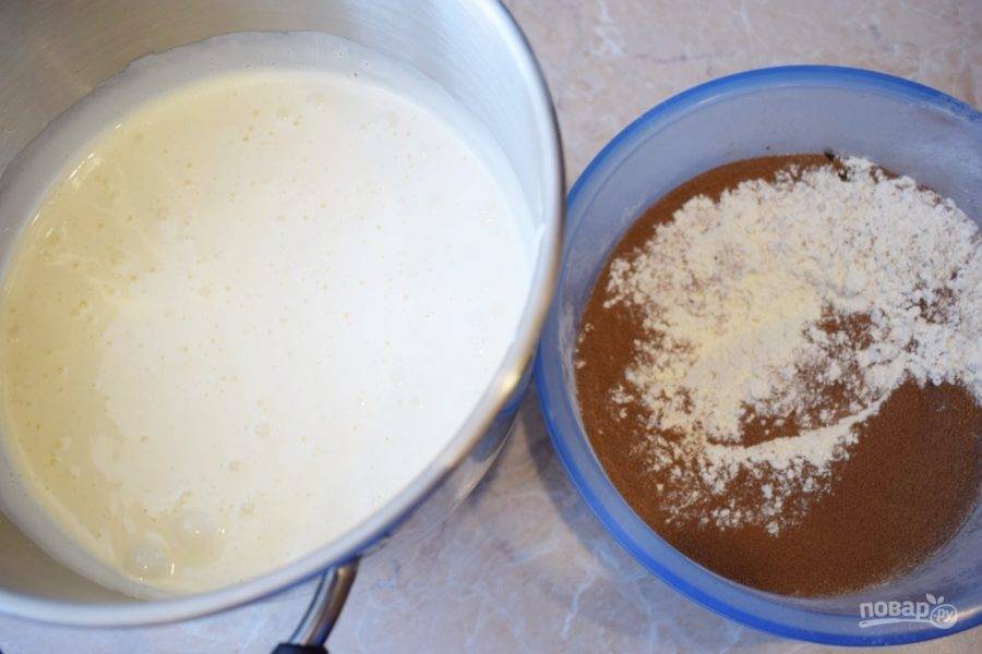 Введите в яичную массу мучную смесь и постепенно подливайте молочную. Венчиком замесите воздушное шоколадное тесто.
