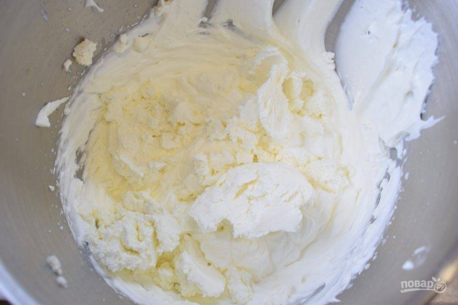 Затем хорошо вмешайте в крем сливочный творожный сыр.
