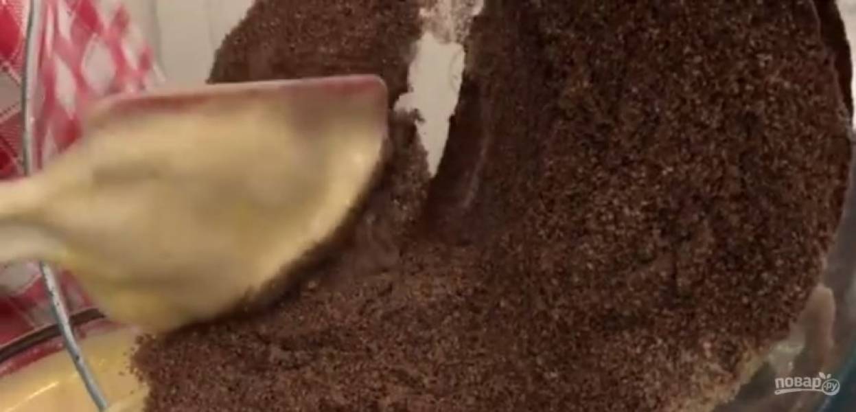 6. Добавьте сахар и снова взбейте. Аккуратно лопаткой смешайте с желтками, перемешивая в одну сторону. Просейте всю муку, какао и разрыхлитель. Смешайте мучную смесь с яичной и перемешайте в одну сторону.