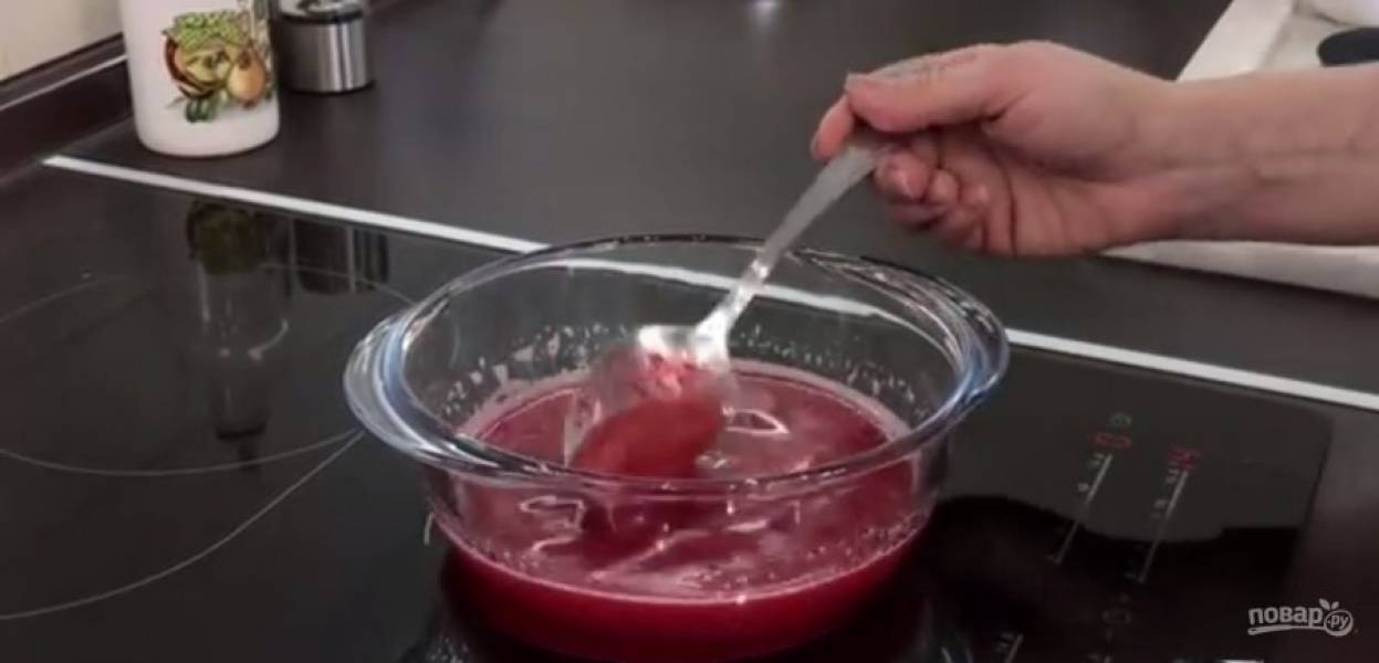 2. Отправьте джем в жаростойкую посуду, отберите две ложки сиропа и смешайте с агар-агаром. Снова отправьте агар-агар к массе, доведите до кипения, постоянно помешивая, и снимите с огня. Залейте сироп в форму и отправьте его в холодильник на 1-2 часа.