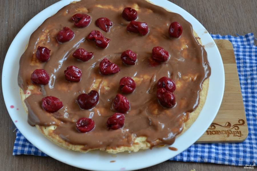 Начинаем собирать торт. Первый корж положите на плоскую тарелку, обильно смажьте кремом и выложите вишню. Желательно использовать карамелизированную вишню и консервированную с сахаром.