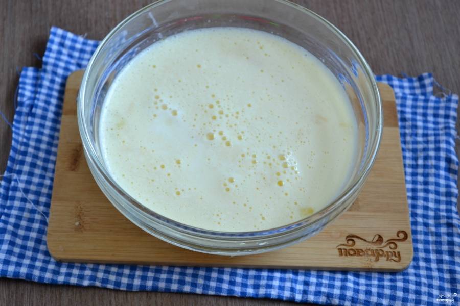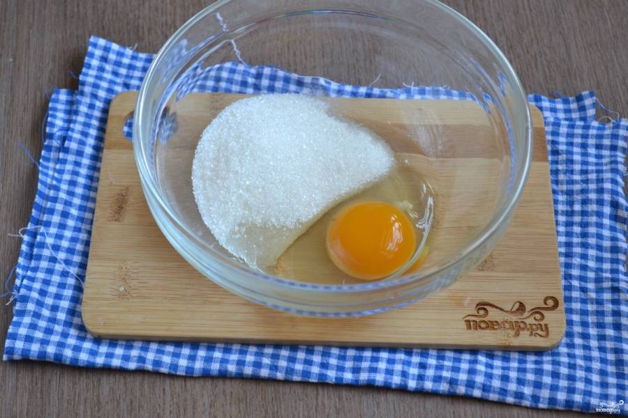 Приготовьте крем, смешайте яйца с сахаром и слегка взбейте вилкой или ручным венчиком до однородности.