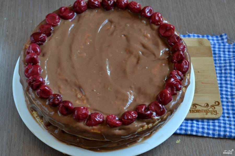 Повторите процедуру с остальными коржами. Сверху торт смажьте кремом, украсьте вишней по желанию. Оставьте торт для пропитки на 5-10 часов. Чем дольше пропитывается торт, тем мягче и вкуснее он становится. Приятного аппетита!