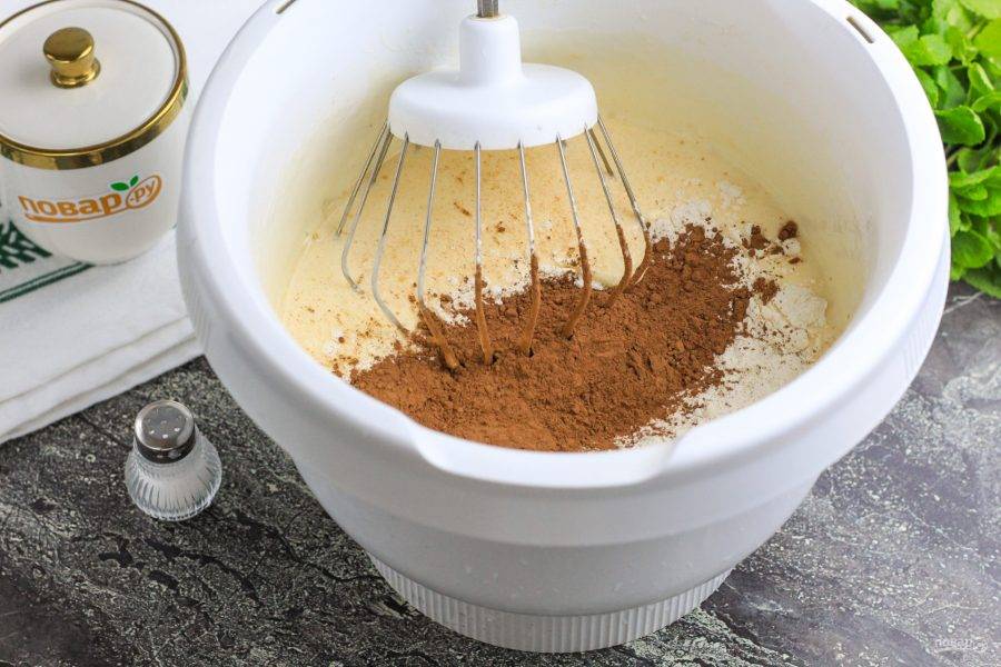Всыпьте какао-порошок и разрыхлитель, аккуратно перемешайте и добавьте пшеничную муку. Вмешайте ее неторопливыми движениями, но не взбивайте!