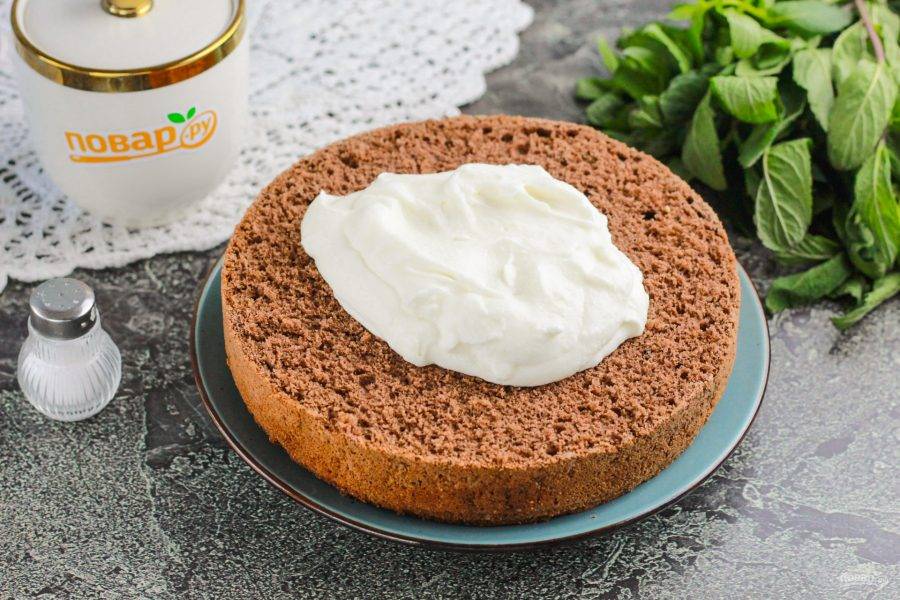 Разрежьте бисквит на несколько коржей: два или три. На нижний корж выложите часть сметанного крема и равномерно распределите.
